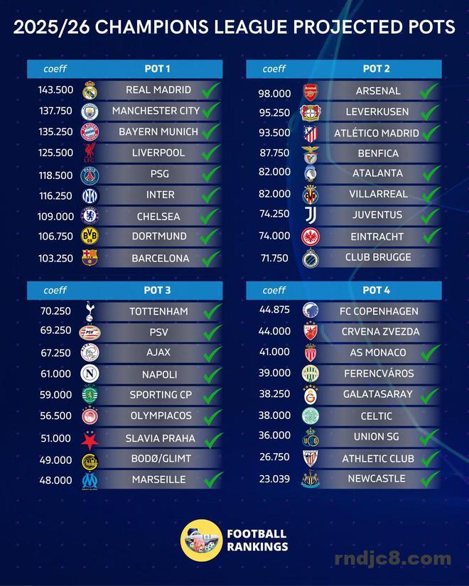 北京时间6月2日,来自Football Rankings的统计指出,目前已经有29家俱乐部锁定了下赛季的欧冠名额,其中包括皇家马德里、曼城、拜仁慕尼黑、利物浦、巴黎圣日耳曼、国际米兰、切尔西、多特蒙德以及巴塞罗那在内的球队已经确定为第一档。余下的7个名额将通过欧冠资格赛决出。