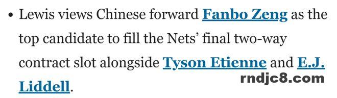 北京时间9月10日,篮网知名队记Brian Lewis撰文解读球队现状,他在文章中谈到了曾凡博的情况,并表示这位中国前锋是篮网最后一个双向合同名额的头号人选。